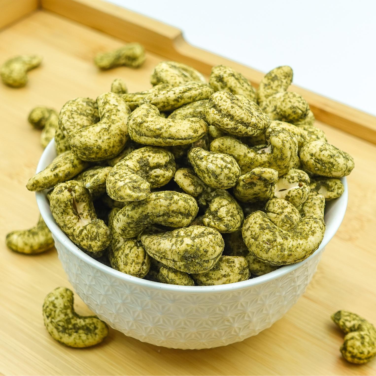 Green chili cashews are nuts infused with the spicy heat of green chilies. They deliver a spicy punch alongside their crunchy texture, offering a flavorful twist to snacking. Perfect for those seeking a spicy snack option
